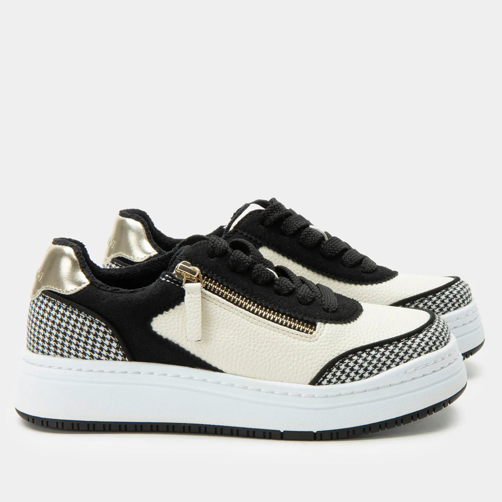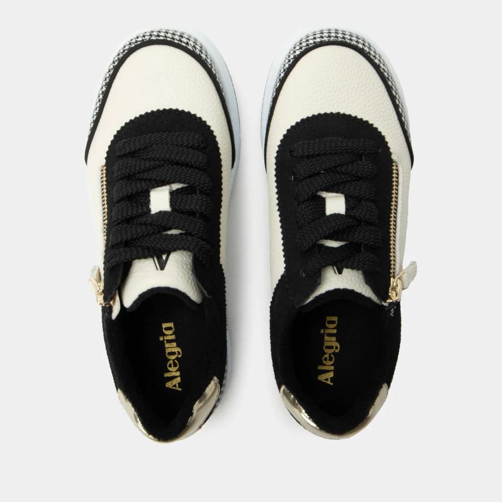 Bring a bold touch to your wardrobe with the Alegria Averie in Houndstooth Black. This retro-inspired sneaker features a slip-resistant EVA Sportform outsole for lightweight comfort, a mix of vegan leather and textured fabric for a modern edge, and a convenient side zipper for easy wear. The cushioned, supportive footbed promotes all-day comfort and foot health, making it perfect for everyday style and function.